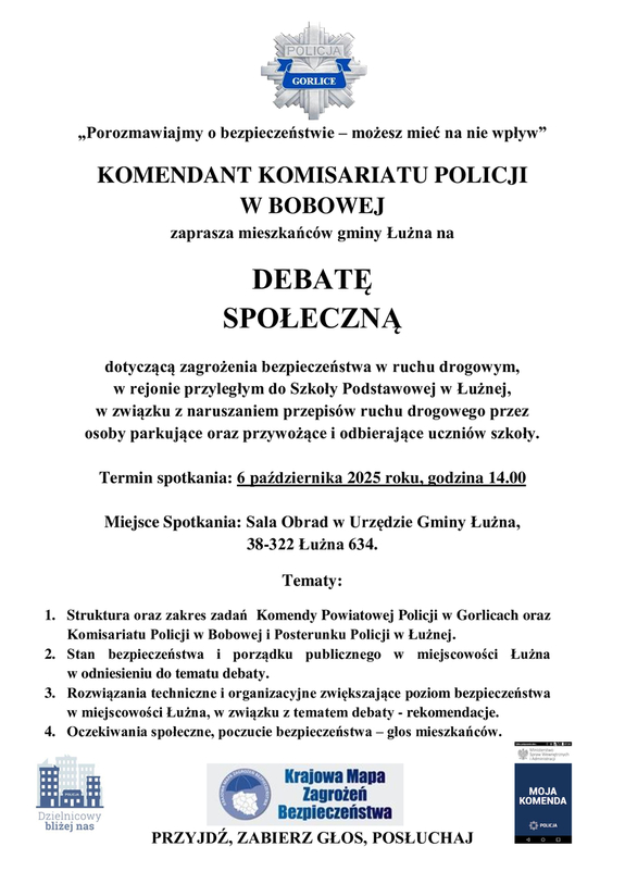 Komendant Komisariatu Policji w Bobowej zaprasza na debatę społeczną, która odbędzie się w dniu 6 października o godzinie 14.00, w sali obrad Urzędu Gminy w Łużnej. Tematem debaty będzie zagrożenie bezpieczeństwa w ruchu drogowym w rejonie Szkoły Podstawowej w Łużnej.