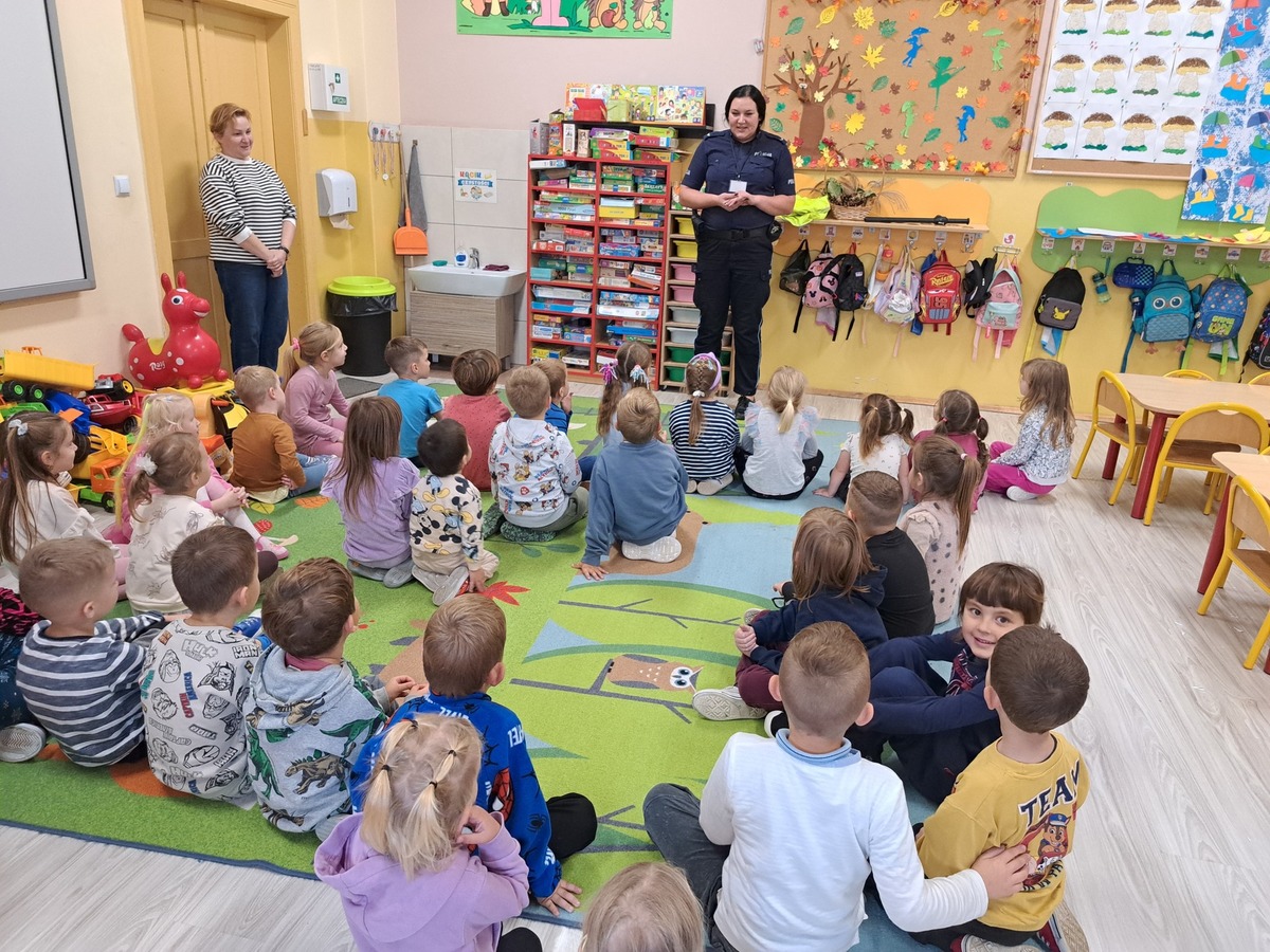 W związku z prowadzonymi w szkole akcjami, w dniu 15 października br. w spotkaniu z uczniami szkoły i przedszkola wzięły udział dwie policjantki – dzielnicowe, pracujące w Komendzie Powiatowej Policji w Gorlicach. Funkcjonariuszki w trakcie spotkania przypomniały dzieciom podstawowe zasady bezpieczeństwa w ruchu drogowym, zasady bezpiecznego poruszania się po drodze oraz znaczenie i konieczność używania elementów odblaskowych na drodze. Uczniowie z ogromnym zainteresowaniem słuchali, aktywnie zadawali pytania i dzielili się swoimi spostrzeżeniami. Ponadto podczas spotkania dzieci mogły z bliska obejrzeć policyjne wyposażenie, ubrać kamizelkę odblaskową, a także zobaczyć policyjny radiowóz.