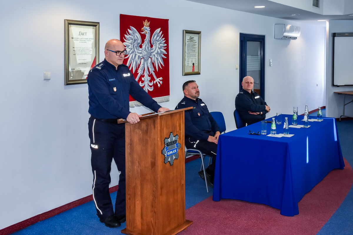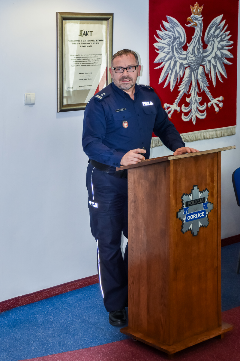 W dalszej części narady głos zabrali zaproszeni gości. Wicestarosta Gorlicki Marcin Krzemiński, dziękując w swoim wystąpieniu za bardzo dobre wynik w pracy na rzecz bezpieczeństwa osiągnięte przez gorlicką Policję, życzył dalszej efektywności i sprawnego działania. Kolejno głos zabrał Burmistrz Miasta Gorlice – Pan Rafał Kukla, który podziękował za sumienną i rzetelną służbę na rzecz mieszkańców Gorlic. Prokurator Rejonowy w Gorlicach – Sławomir Korbelak, podziękował komendantowi i funkcjonariuszom za bardzo dobrą współpracę z prokuraturą i życzył bezpiecznej służby. Następnie głos zabrał Komendant Powiatowy PSP w Gorlicach – mł. bryg. Waldemar Krok, który podziękował za przykładną współpracę z policją, a także za realizowane wspólne służby i patrole.