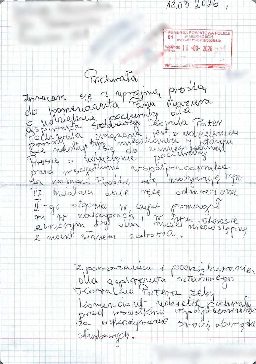„ Zwracam się z uprzejmą prośba do Komendanta Pana Mazura o udzielenie pochwały dla aspiranta sztabowego Konrada Pater. Pochwała jest związana z udzieleniem mi pomocy … …pomagał mi w zakupach w tym okresie zimowym”.