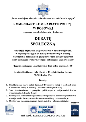 - Komendant Komisariatu Policji w Bobowej zaprasza na debatę społeczną do Łużnej Komendant Komisariatu Policji w Bobowej zaprasza na debatę społeczną, która odbędzie się w dniu 6 października o godzinie 14.00, w sali obrad Urzędu Gminy w Łużnej. Tematem debaty będzie zagrożenie bezpieczeństwa w ruchu drogowym w rejonie Szkoły Podstawowej w Łużnej.